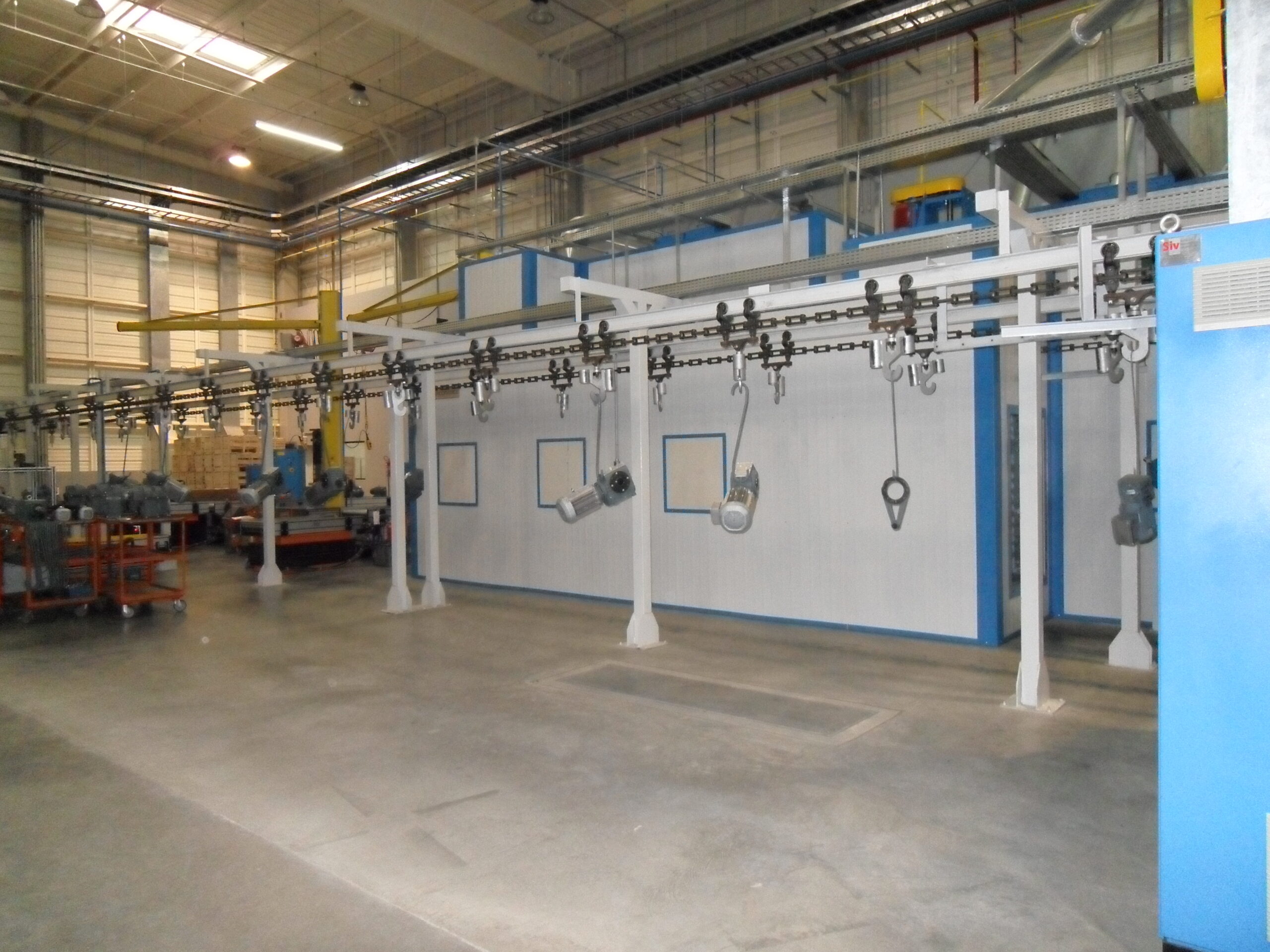 Nossos transportadores são equipados com sistemas de segurança antidisparo e antiretorno , Sobrecarga na corrente , possuem sistema automático de lubrificação dos trolleys e da corrente , podem ser equipadoscom esticadores pneumáticos ou por molas .